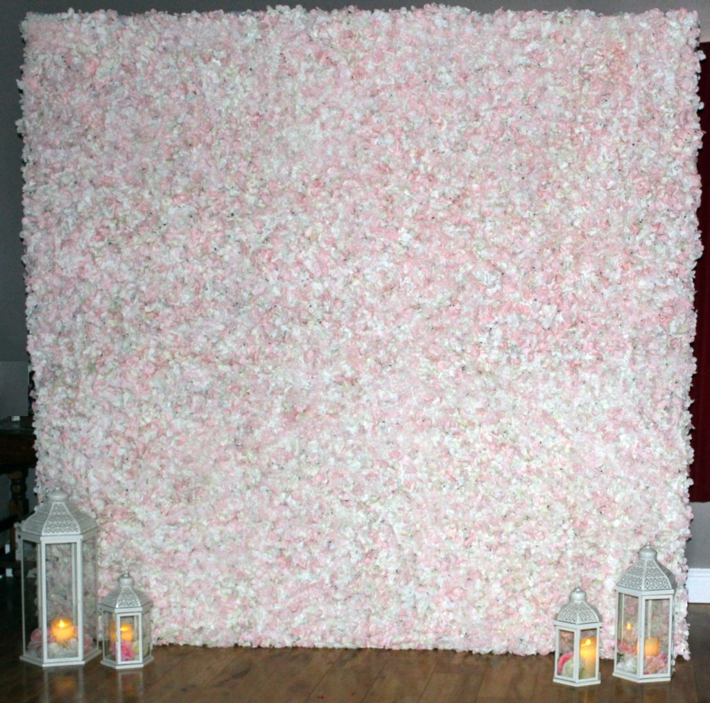 Elegant Large 8Ft x 8Ft pink & white Hydrangea flower wall features artificial pink and cream hydrangea petals. used as a backdrop for photographs for your guests during the day and evening, perfect for all event types.